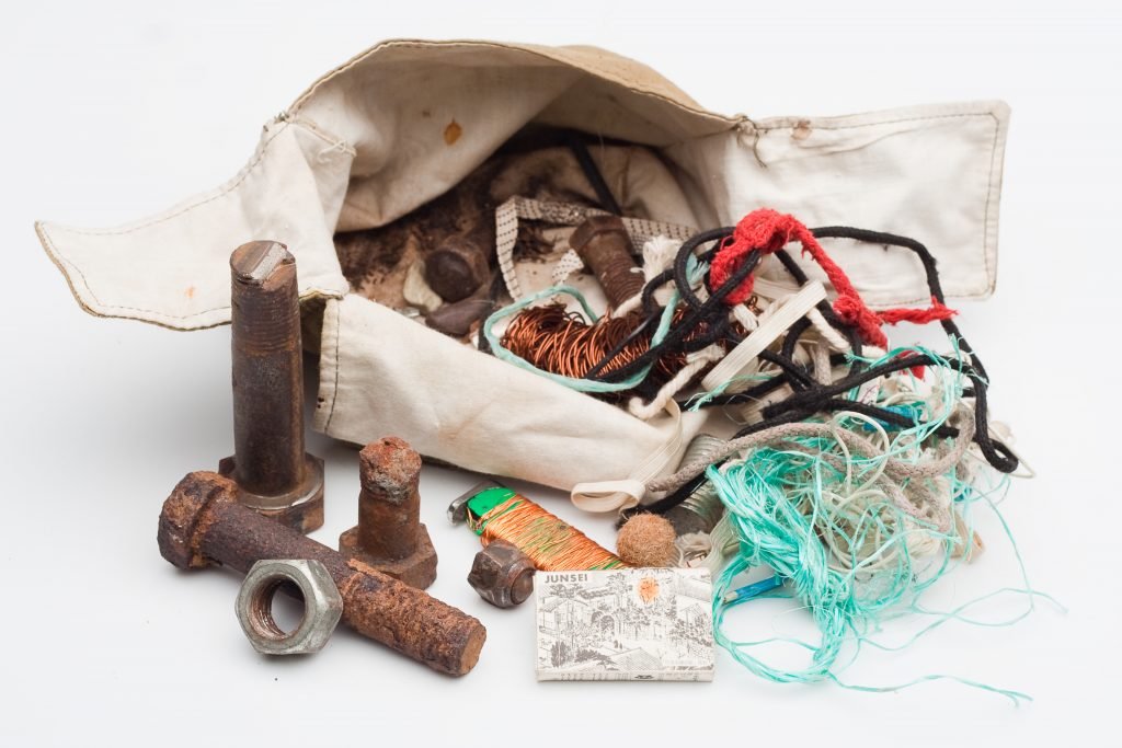 The bag full of small things like bolts, mini ropes retrieved from the roadsides in Lithuania and abroad. Not connected to specific places, it is more about the loneliness and observing the surroundings.